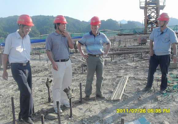 圖為:自治區(qū)交通運輸廳王劼耘總工程師(右三)在拉會高架大橋施工現(xiàn)場調(diào)研指導(dǎo)