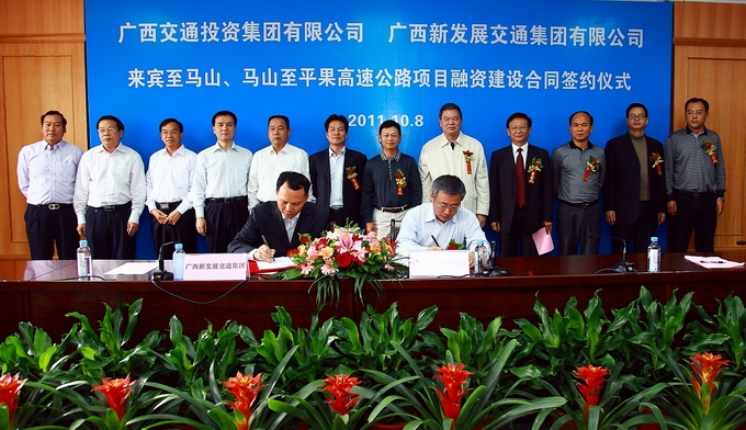 10月8日,集團公司和廣西交通投資集團公司來賓至馬山、馬山至平果高速公路項目融資建設合同簽約儀式在南寧舉行。自治區(qū)交通運輸廳廳長潘巍、總工程師王劼耘;集團公司董事長、黨委書記朱堅和,總經(jīng)理李定倫,黨委副書記、紀委書記張友坐,副總經(jīng)理劉明洪,總會計師鄧遠志,總工程師覃炳賢;交投集團副董事長、總經(jīng)理、黨委副書記劉可,黨委副書記、紀委書記羅斯卡,副總經(jīng)理韋昌鴻、廉向東,及雙方有關部門、直屬各單位負責人參加了簽約儀式。