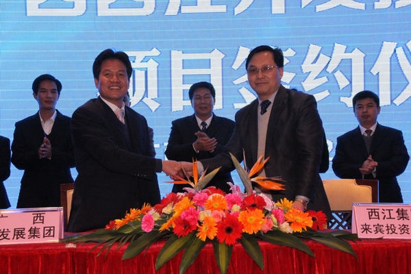 圖為:2月27日,圖為朱堅(jiān)和董事長(zhǎng)(左)與廣西西江開(kāi)發(fā)投資集團(tuán)代表簽署合作意向協(xié)議