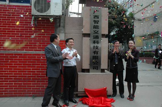圖為:自治區(qū)交通運輸廳副巡視員符茂清(右二),集團公司副總經理劉明洪(左二)為廣西智能交通科技有限公司成立揭牌