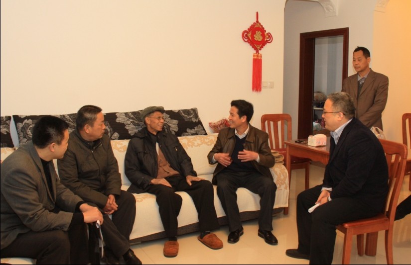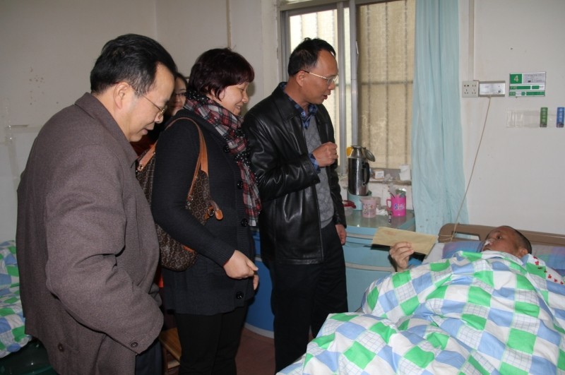 集團(tuán)公司總經(jīng)理李定倫(左三)和總工程師覃炳賢(左一)慰問生病住院的老黨員何家福同志
