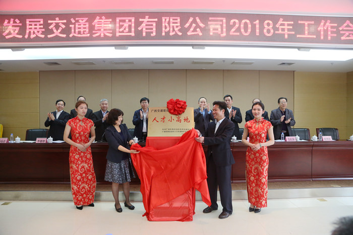 會后,自治區(qū)國資委副巡視員鞏學青與集團公司黨委書記、董事長朱堅和一同為集團公司“廣西交通建設人才小高地”揭牌。