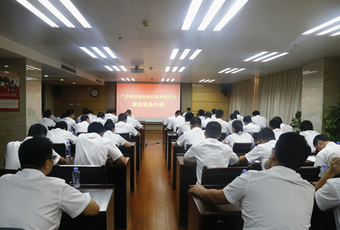 活動(dòng)上,新恒通公司黨委書記、董事長(zhǎng)賴水平還對(duì)與會(huì)人員進(jìn)行了廉政集體約談。賴水平感謝吳雄飛老師給大家上了一堂別開生面的廉政警示教育課,作為交通基礎(chǔ)設(shè)施建設(shè)行業(yè)的業(yè)主單位,在廉潔從業(yè)的道路上,他提出幾點(diǎn)要求和期望:一是加強(qiáng)學(xué)習(xí),提升道德修養(yǎng),堅(jiān)定理想信念;二是嚴(yán)于律己,規(guī)范作風(fēng)行為,筑牢防腐堤壩;三是嚴(yán)以用權(quán),增強(qiáng)廉政意識(shí),緊守從業(yè)底線;四是守土有責(zé),堅(jiān)持“一崗雙責(zé)”,深化責(zé)任落實(shí)。賴水平強(qiáng)調(diào),廣西交通基礎(chǔ)設(shè)施建設(shè)正處于大有可為、大有作為的歷史機(jī)遇期,面對(duì)紛繁復(fù)雜的形勢(shì),全體黨員干部要在黨的十九大精神的指引下,緊緊圍繞公司總體工作思路和目標(biāo),統(tǒng)一思想,堅(jiān)定信念,持續(xù)加強(qiáng)作風(fēng)建設(shè),堅(jiān)決把紀(jì)律挺在前面,耳邊常響廉潔警鐘,心中常筑反腐防線,用廉潔從業(yè)的實(shí)際行動(dòng)為公司“縣縣通”高速公路建設(shè)事業(yè)的發(fā)展保駕護(hù)航。
