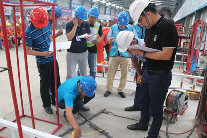 本次比賽采用Ф28鋼筋作為焊接母材,共分為單面平焊、立焊、仰焊三個比賽項目,每位參賽選手需在規(guī)定時間內(nèi)按照比賽要求焊接一組試件。評委按照鋼筋焊縫長度、焊縫深度、焊縫寬度、焊接時間、是否有咬邊、焊接平整度、焊接成型等幾個方面進行評分。