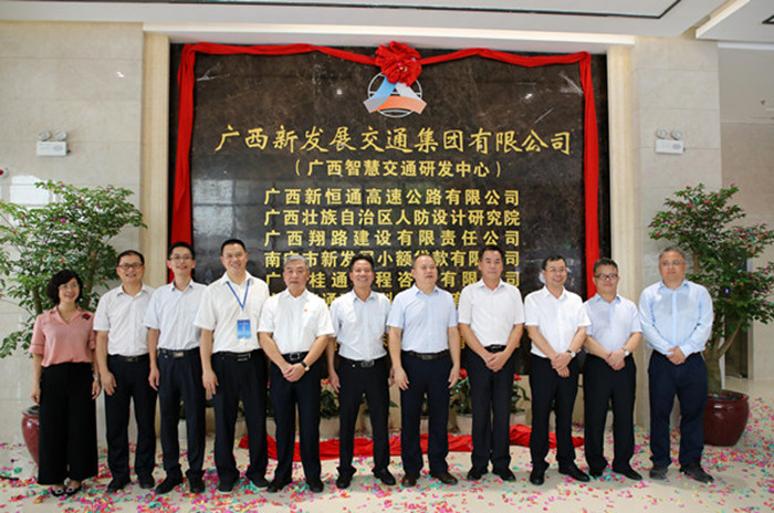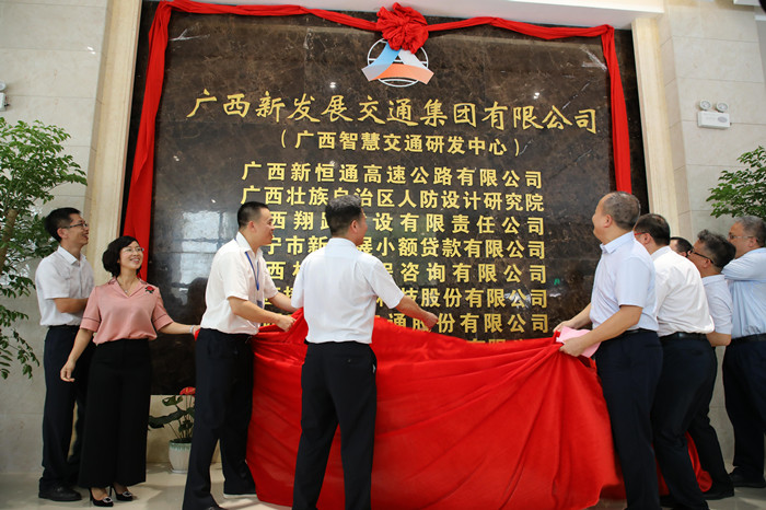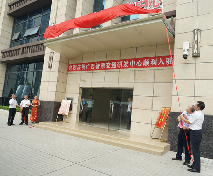在喜慶熱烈的氣氛中,集團公司領(lǐng)導朱堅和、唐咸秋、翁科、韋慶和共同為廣西智慧交通研發(fā)中心暨入駐單位揭牌。儀式結(jié)束后,領(lǐng)導合影留念,并參觀了新辦公樓。