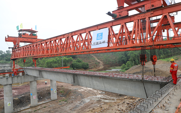 本次架設(shè)箱梁的為那隆互通主線橋,位于靈山段那隆鎮(zhèn)主線K72+709.5-K72+806.5處。該橋全長97米,共3跨,每跨30米,上部構(gòu)造為先簡支后連續(xù)結(jié)構(gòu),設(shè)計雙向四車道。為保障本次架設(shè)工作順利進行,大浦公司周密部署,采取多項有效措施:一是結(jié)合項目特點,貫徹北投集團和新發(fā)展集團高速公路項目建設(shè)推進會精神,會同總監(jiān)辦、施工單位提前進行技術(shù)交底,確定架設(shè)方案;二是積極動員,科學部署當日各項環(huán)節(jié)和作業(yè)流程;三是加強管控,現(xiàn)場派人進行監(jiān)督指導。在做好充分準備的情況下,大浦路全線首片箱梁成功完成架設(shè)。