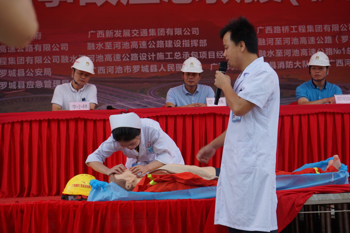 當(dāng)天的演練現(xiàn)場(chǎng)模擬情景為:2019年6月20日,在羅城縣四把鎮(zhèn)沖灣屯附近,融河高速公路K54+100高邊坡處現(xiàn)場(chǎng)4名邊坡防護(hù)作業(yè)人員正在緊張的施工,由于連續(xù)雨天上邊坡坡頂土體部分突然滑落,繼而出現(xiàn)大的滑坡裂縫,隨之大面積土石體坍塌,1名施工人員被垮塌的土石壓埋。事故發(fā)生后,參與演練人員及時(shí)報(bào)告和啟動(dòng)應(yīng)急預(yù)案,在坍塌現(xiàn)場(chǎng)設(shè)置臨時(shí)指揮部,指揮現(xiàn)場(chǎng)救援,將傷者抬出被困位置后,在演練會(huì)場(chǎng)進(jìn)行現(xiàn)場(chǎng)醫(yī)療和急救演示,再由救護(hù)車(chē)送到羅城縣人民醫(yī)院進(jìn)一步治療。