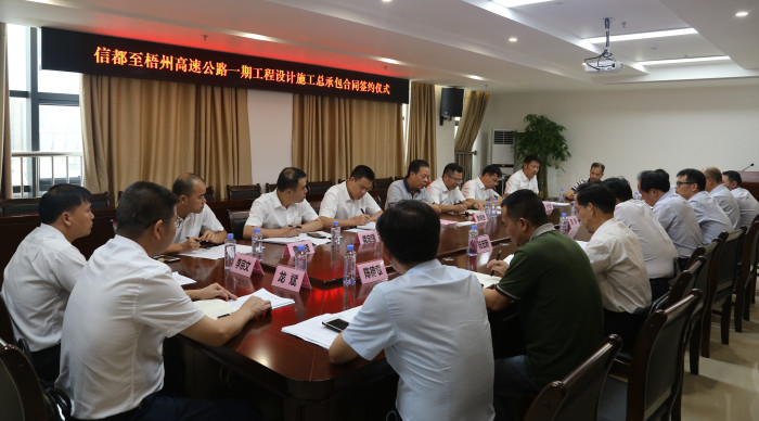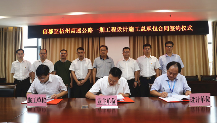 2019年7月22日下午,信都至梧州高速公路一期設(shè)計(jì)施工承包合同簽約儀式在廣西智慧交通研發(fā)中心1926會議室舉行。北投集團(tuán)總工程師覃炳賢,公司領(lǐng)導(dǎo)賴水平、藍(lán)日彥、龔定強(qiáng)、蘇偉勝及中標(biāo)單位路建集團(tuán)、交通設(shè)計(jì)集團(tuán)的領(lǐng)導(dǎo)以及各單位相關(guān)部門代表參加儀式。